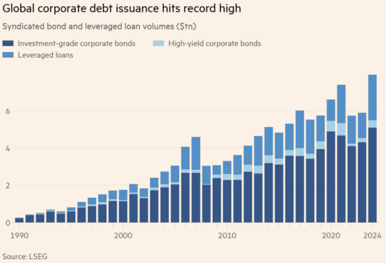 Global Corporate Debt Issuances Hit Record: The Financial Times reported that Global corporate debt issuances jumped to ~$8 Trillion from under $6 Trillion in 2023. We note below that there is a decent rise in all debt issuances, including investment-grade corporate debt. Companies such as Home Depot and Abbvie raised significant amounts via debt sales. If we think logically, the investment-grade companies raised ~1 Trillion more than in 2023. The yields on investment-grade corporate debt are higher now, i.e., 5.4%, due to higher treasury yields. Considering that good companies raise a trillion dollars extra at a higher rate, these well-managed profit-making corporations expect good times ahead or have confidence that they can put the new capital to better use and generate returns than they paid. There is a sharp rise in high-yield debt issuances, but I would prefer to focus on what investment-grade corporations do to infer general mood as they have better management and track records.