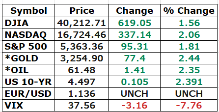 Good Afternoon. This was another busy week with a lot of action. Last week, I wrote that based on my analysis, it is premature to assume we will have a trade war. The selloff in treasuries forced this administration to announce a 90-day pause on all reciprocal tariffs except China. These positive developments helped stocks reverse half their losses from liberation day.