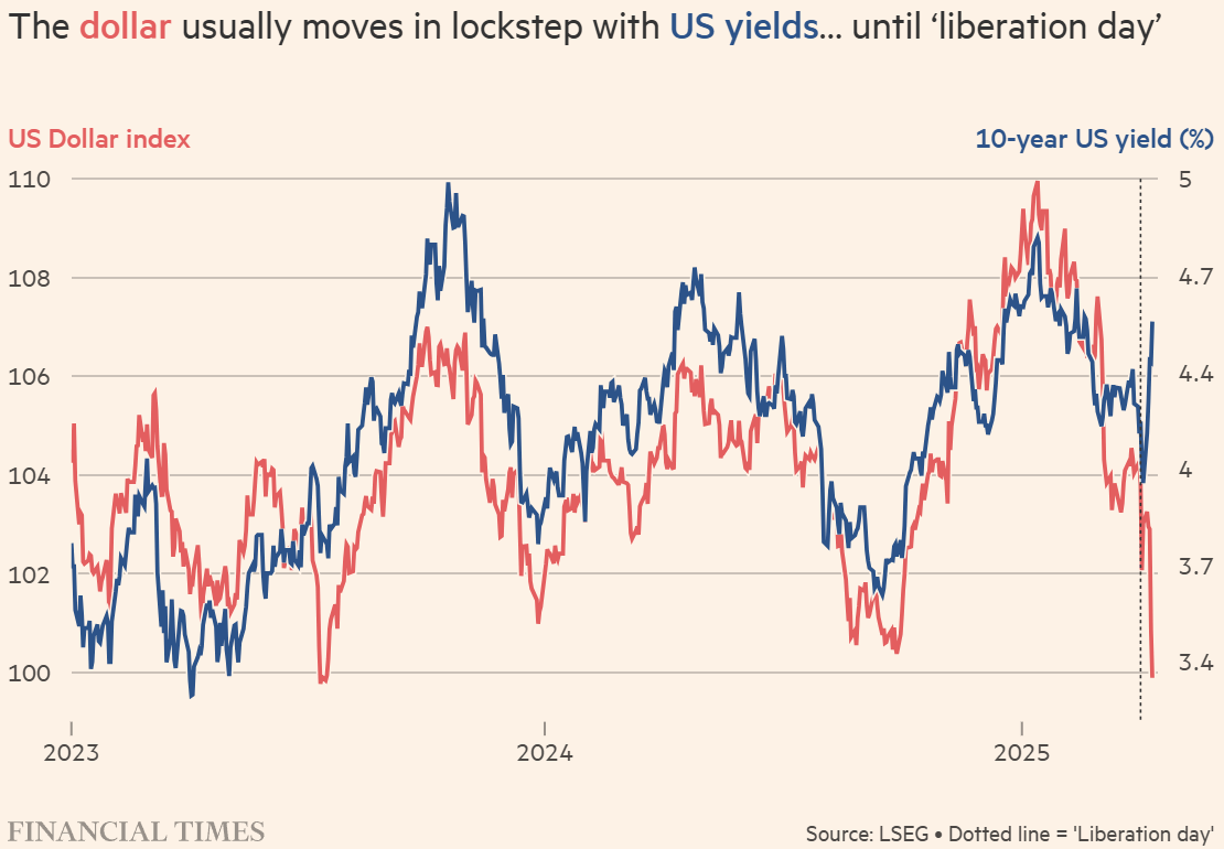 The US dollar hit a three-year low against the Euro on Friday, extending losses from last week after President Trump unveiled steep “reciprocal” tariffs on US trading partners. Generally, USD has historically appreciated during stress due to a flight to safety, but that did not occur this time. The chart below shows that the USD and 10-year bond yields have no longer been correlated since liberation day. During stress periods, investors used to rush to safe US Treasury assets, driving the demand for dollars (as to purchase US Treasuries, foreign investors need to convert their currencies into USD, driving demand for USD). These developments doubt the Dollar’s status as the world’s reserve currency. Investors/Central Banks have been moving towards Gold for safety in the past few years, and that trend is continuing, with Gold recording its best weekly gain in five years.