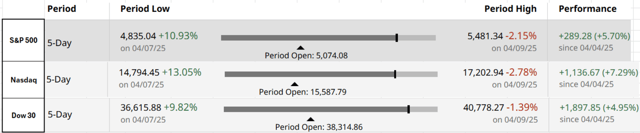 The S&P 500 is up 5.70%, the Nasdaq is up 7.29%, and the Dow 30 is up 4.95%.