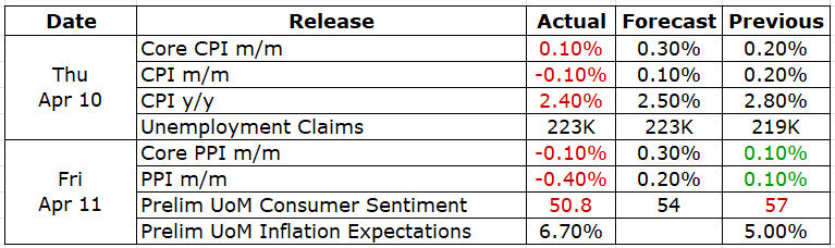 CPI declined 0.1% in March, led by a 6.3% drop in gasoline, pulling headline inflation down to 2.4% YoY from 2.8% in February. Food prices continued to rise (+0.4% m/m), and core inflation (ex. food and energy) edged up 0.1% on the month, bringing its annual rate to 2.8%, the slowest since March 2021. Falling prices in used cars, airfares, and insurance offset gains in personal care, education, and new vehicle purchases. Based on this, the end-of-month PCE release should be good. The Cleveland Fed March PCE forecast is at 2.2%.