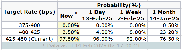 Inflation: The CPI number came in hotter than expected on Wednesday. The CPI rose 0.5% in January, following a 0.4% increase in December. Year-over-year, it climbed 3.0%, up from December’s 2.9% gain. Again, CPI is not the Fed’s preferred measure, and what matters is the PCE, which is expected to come at the end of the month. The key components that feed into the PCE, i.e., healthcare or transportation, have reported slowed growth. Hence, the PCE is expected to be ~2.5%, and the core PCE to be ~2.8% in two weeks. Any print hotter than this may cause volatility in the market. The inflation is sticky as expected, diminishing any chances of the rate cut in the next Fed meeting.