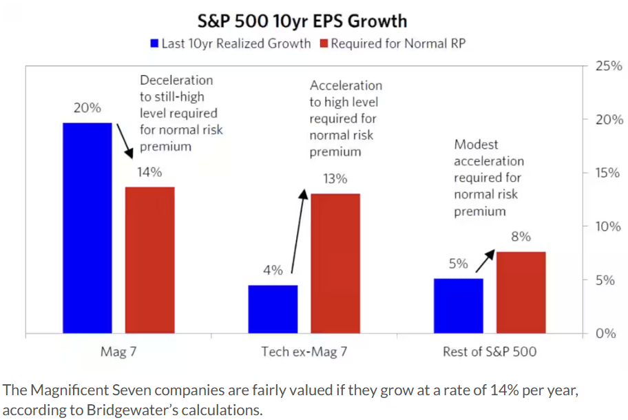 According to Bridgewater, investors should not focus only on the valuations of the Mag 7 stocks. Mag 7 stocks need to grow EPS by 14% annually over the next decade to earn a normal risk premium over bonds, below their recent 20% pace. The broader tech sector also needs that growth but has managed only 4% annually over the last decade. The remaining 55% of the S&P 500 must grow EPS by 8% annually, above their past 5% but below tech’s hurdle. Read