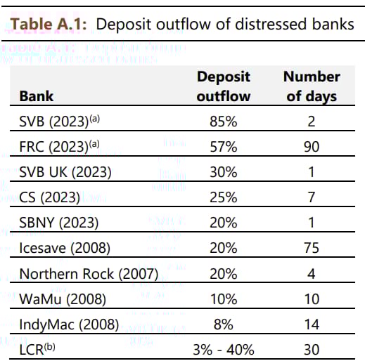 Please check my detailed blog covering the key takeaways from this report. Below is crucial information from the report summarizing the speed and materiality of deposit outflows from the banks that collapsed in the 2008 Global Financial Crisis and last year's 2023 Banking Stress.