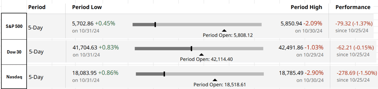 Good Afternoon. This week was packed with earnings and macro data. To date, ~70% of S&P 500 companies have reported earnings. The curated insights section has more stats about earnings. The most crucial macro news is that the PCE inflation dropped to 2.1% from 2.3% last month. PCE is the Fed’s favored measure for its 2% inflation target, which it seems it has almost achieved now. The core PCE (PCE excluding volatile food and energy), however, increased to 2.7% from 2.4% last month. As this aligns with the Fed’s expectations, the Fed will cut the rate by 25bp next week. Market expectations per CME Fed watch also show a ~99% probability of a 25bp cut. The next week is crucial, with the results of the US elections on Tuesday and the Fed rate cut decision on Thursday.