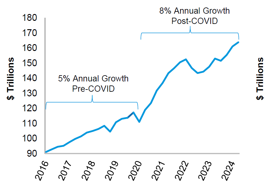 Household wealth has grown rapidly to over $160 trillion, supporting consumer spending. This growth rate accelerated post covid. This is primarily due to an appreciation of home prices and stock market performance.