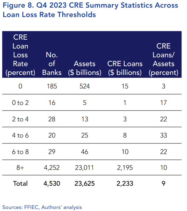 Three large US banks failed in 2023 due to the rapid exit of uninsured deposits and unrealized securities losses. Office of Financial Research’s analysis shows that even now, hundreds of banks still have large unrealized securities losses and uninsured deposits that may be vulnerable to significant commercial real estate (CRE) loan losses. This approach, combined with measures of uninsured deposit levels, serves as a way of assessing vulnerable banks. Had the approach been applied to SVB in the second half of 2022, it would have signaled a significant risk of failure up to nine months before SVB’s collapse. As of Q4 2023, 185 banks with $524 billion of assets had unrealized securities losses that exceeded their shareholders’ equity.