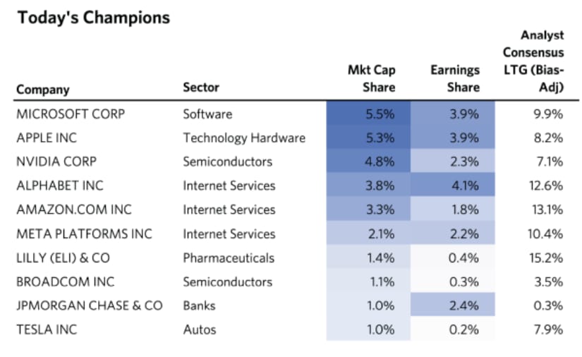 Today’s champions, the current share of their market cap and earnings, and analyst estimates of long-term growth.