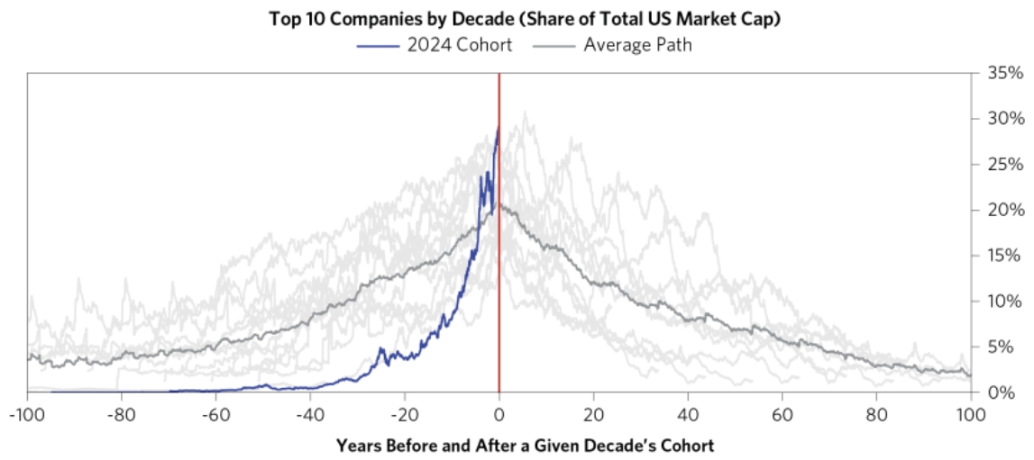 The below chart shows the rise and fall of the largest companies by market cap across different decades (each gray line represents the market cap share of the champions at the start of each decade).
