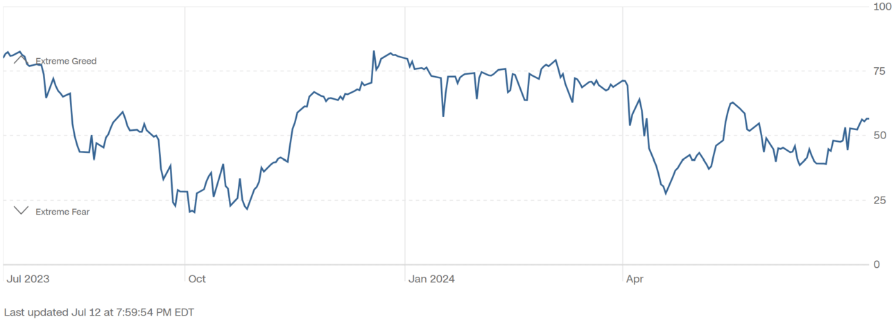 CNN's Fear & Greed Index changed from Neutral to Greed and now stands at 56 (Greed) out of 100, a marginal increase of 2 points from last week.