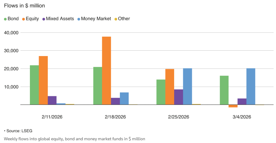 Global investors cut exposure to equity funds for the first time in eight weeks as the escalating U.S.–Iran conflict reignited inflation fears and weakened risk appetite. U.S. equity funds led the decline, recording $21.9B in outflows—the largest since Jan 7—pushing global equity funds to a net $1.44B outflow.