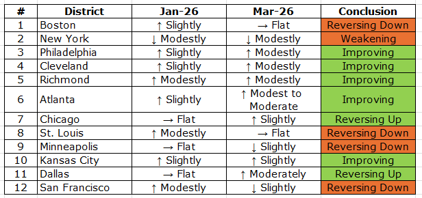 Overall activity improved: 7 districts reported slight-to-moderate growth; 5 were flat or down