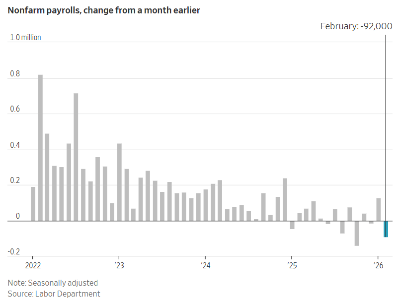 U.S. employers cut 92,000 jobs in February, a sharp reversal from January’s 126,000 gain and far worse than the 50,000 increase economists expected. The unemployment rate edged up to 4.4%, signaling emerging weakness as job growth has slowed across multiple sectors in recent months.