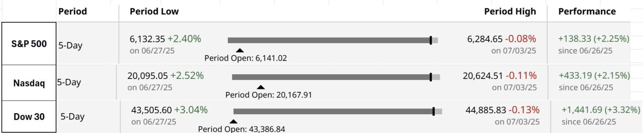 Good Afternoon. Another positive week for the markets, with Nvidia approaching the $4 trillion market cap. Nasdaq and S&P 500 both closed at all-time highs, and the Dow 30 is just 0.41% away from its all-time high. The macro data was strong, including the jobs report. In addition, Trump signed the Tax Cuts and Jobs Act. Next week is relatively quiet with just FOMC minutes releasing on Wednesday until we kick off earnings season with major banks reporting on July 15th.