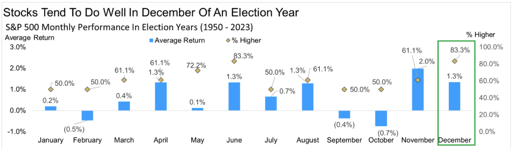 In general, December is a positive month 74% of the time. This probability is even higher, i.e., 83% in the election year.