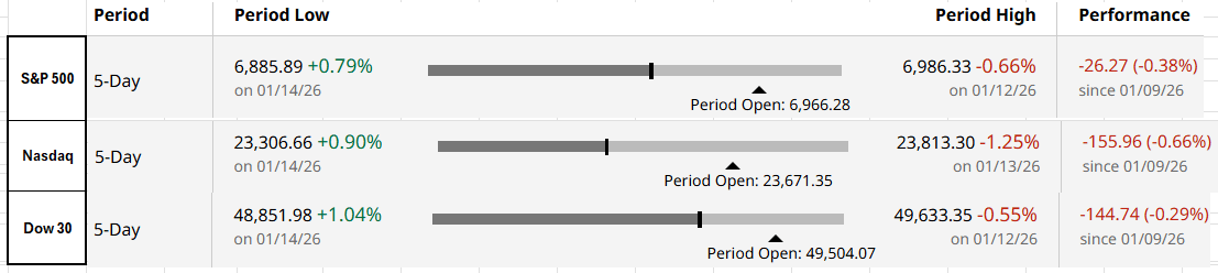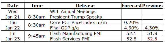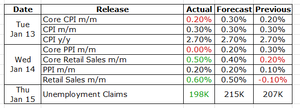 Inflation held steady into the year-end. Headline CPI rose 2.7% year over year in December, unchanged from November. The data is somewhat noisy due to distortions from the recent government shutdown, but price pressures in consumer staples—particularly food and electricity—remain elevated. Based on CPI data, the Fed’s preferred gauge, the PCE, is expected to be ~2.6% and will be released at the end of this month.For the week: