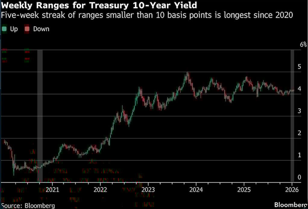 Bloomberg reported that U.S. Treasury markets are exhibiting historically low volatility, with the 10-year Treasury yield trading in a narrow band for a fifth consecutive week — its longest stretch of inertia in nearly two decades. Since mid-December, the yield has oscillated roughly between 4.1% and 4.2%, reflecting market expectations of steady monetary policy and scant directional catalysts.